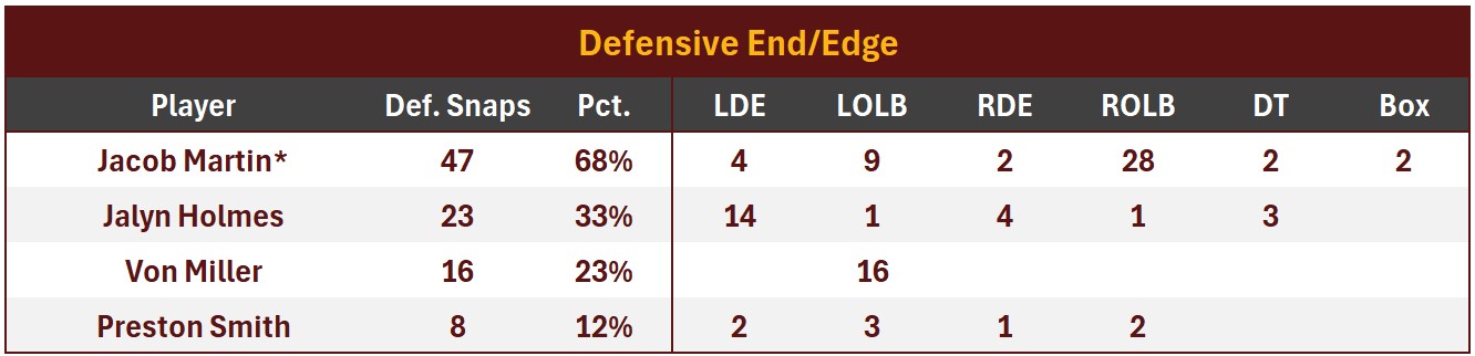 Jacob Martin led the Commanders in sacks (2) and total QB pressures. NFL official stats credit him with 3 QB hits, in addition to the sacks. Using those stats, he led the edge rushers with a 15.6% Pressure Rate. He also recorded 2 TFL, to bring him up to 4 defensive stops, and had 1 missed tackle.