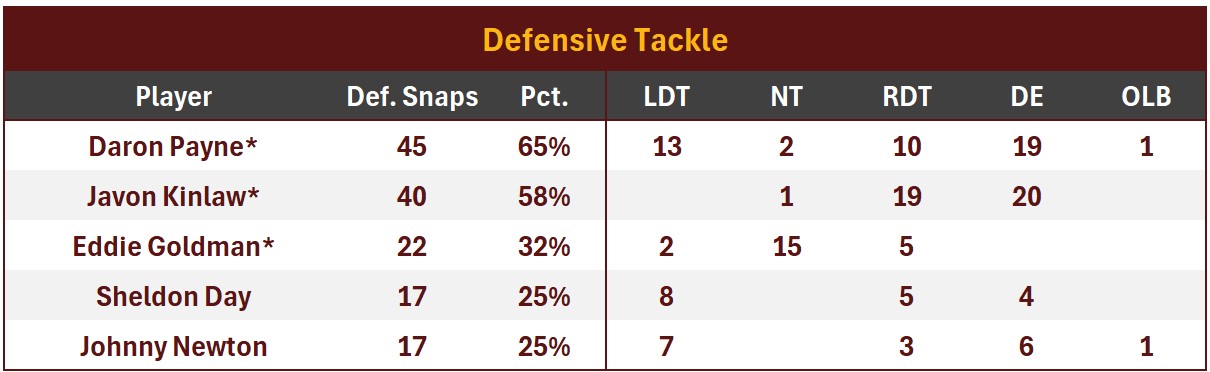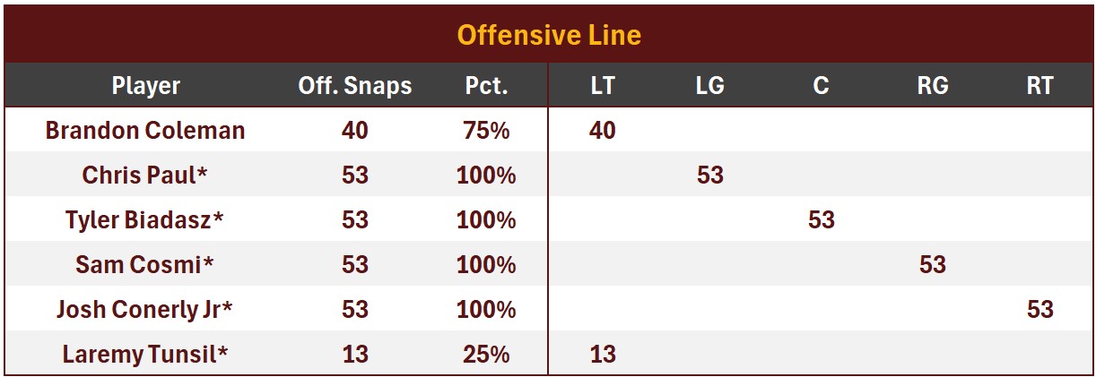 Rookie RT Josh Conerly Jr had another rough outing, allowing 1 sack and 4 hurries (13.9% Pressure Rate). He rated much better as a run blocker, with a 64.1 grade. Conerly also Committed Washington’s only penalty on offense – a false start flag for 5 yards.