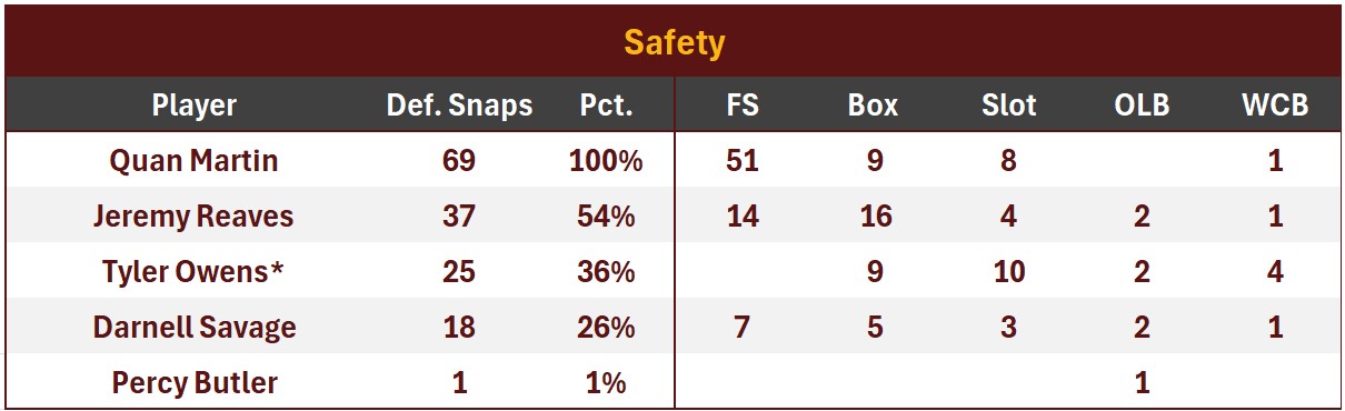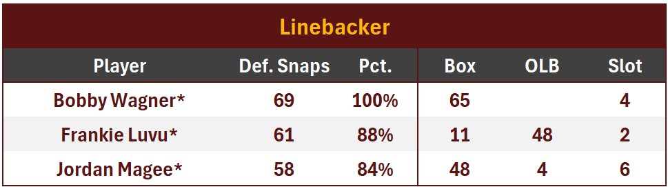 Jordan Magee played a full-time starter’s load for the first time in his career. He made 3 tackles and 1 assist, with no stops and 1 missed tackle per PFR (0 misses per PFF). According to PFF, he had 4 targets in coverage, allowing 3 rec for 57 yds. PFR counted 2 rec for 26 yds.