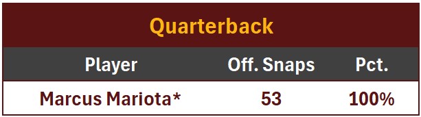 In his third start of the season filling in for an injured Jayden Daniels, Marcus Mariota completed 21/30 passes (70%) for 213 yds and 1 TD with 2 INT. According to PFF, he was pressured on He took 2 sacks for 13 yds and was pressured on 42.9% of dropbacks and took 2 sacks for 13 yds (13.3% Pressure to Sack Rate). His receivers dropped 3 of his catchable throws (12.5% Drop Rate).