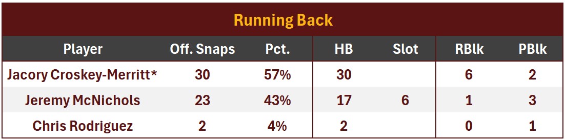 Bill Croskey-Merritt was second on the team in rushing yards, with 9 attempts for 25 yds (2.8 Y/A) and 2 first downs (Success Rate 55.6%). He had 1 passing target and no catches.