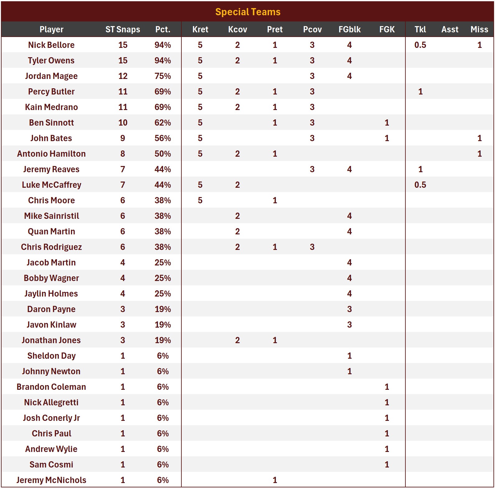 Filling in for injured Matt Gay, K Matthew Wright was 1/1 on extra points and did not get an opportunity to attempt a field goal.
