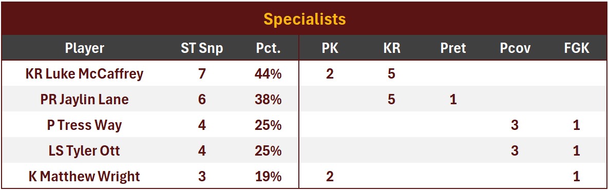Luke McCaffrey continued to impress with 1 return for 37 yds and 0 fair catches. He currently ranks 2nd in return average at 30 YPA behind Seattle’s Dareke Young (32.2 YPA) among players with a minimum of 10 kick returns.