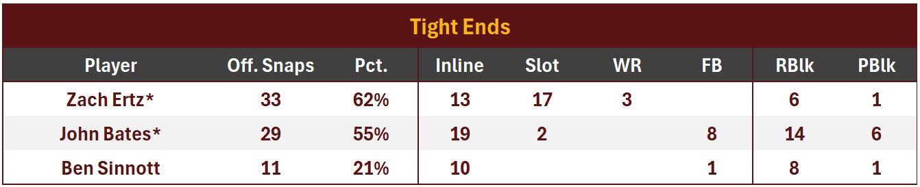 Ben Sinnott and John Bates had identical stat lines. They jointly led the TEs in receiving yards, each catching 1/1 targets for 22 yds. Sinnott was by far the most productive receiver on the team at 11.0 Y/RR, by virtue of only running 2 routes and being targeted on one of them. Bates was not bad at 2.44 Y/RR.