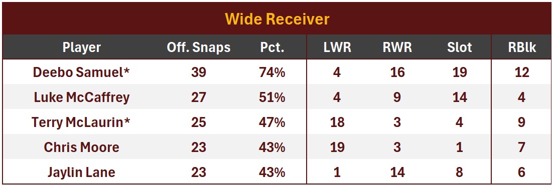 Deebo Samuel caught 3/6 targets for 11 yds (50% rec, ADOT 4.8 yds). He had 1 concentration drop which resulted in an interception. His 33.3% receiving Success Rate was, surprisingly, only the third lowest among Commanders with multiple targets. His receiving productivity was second lowest on the team at 0.42 Y/RR. He had 1 rushing attempt for 1 yd.