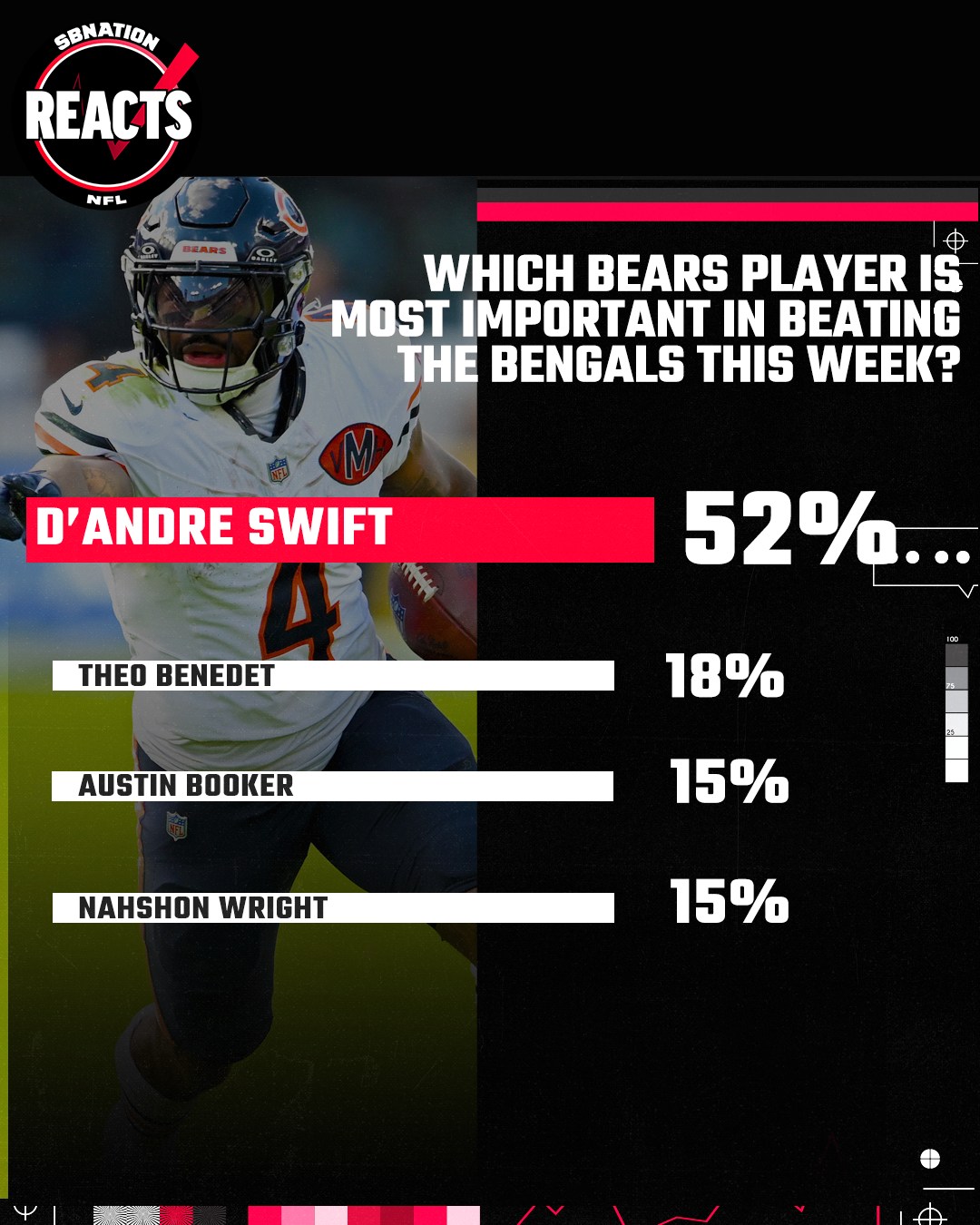Earlier this week, we asked you guys to give your most important Bear for the game in our Reacts survey question, and you went with Swift. The poll was shared before we knew his game status (OUT), but this shows just how important fans feel the rushing attack will be this week.