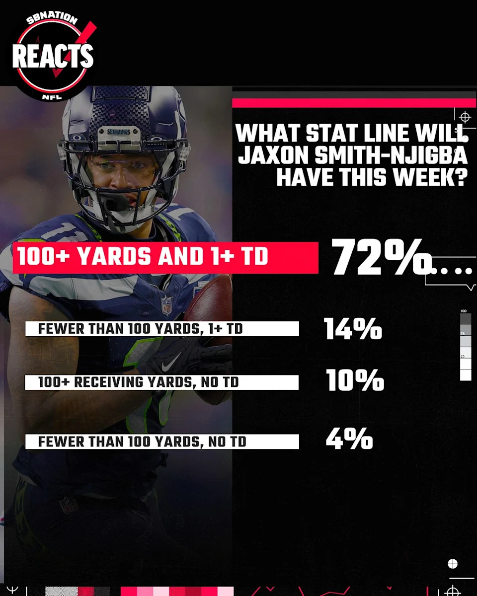 The fans are quite confident in JSN’s ability to continue at his astounding pace, with 86% feeling that he will get at least one TD and 82% believing that he will finish with at least 100 yards. 72% believe that Smith-Njigba will have another game with both of these marks, which would be his fourth consecutive game of the season with at least 100 receiving yards and a touchdown. You know you’re a successful wide receiver when it’s not a question of whether you will have a good game, but how good of a game you will have.