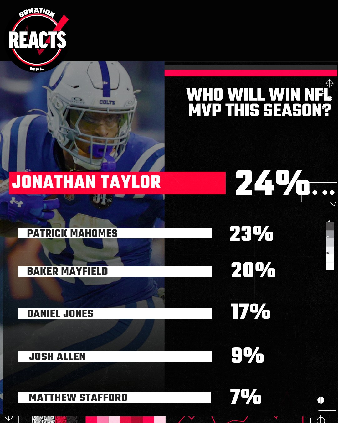 Wrong! Leading the way with voters right now is Indianapolis Colts running back Jonathan Taylor (24%), but a couple of quarterbacks are hot on his heels in Patrick Mahomes (23%) and Baker Mayfield (20%). Taylor’s new favorite quarterback, teammate Daniel Jones finished fourth here (17%), while Josh Allen landed fifth (9%). Matthew Stafford round out the group at six (7%).