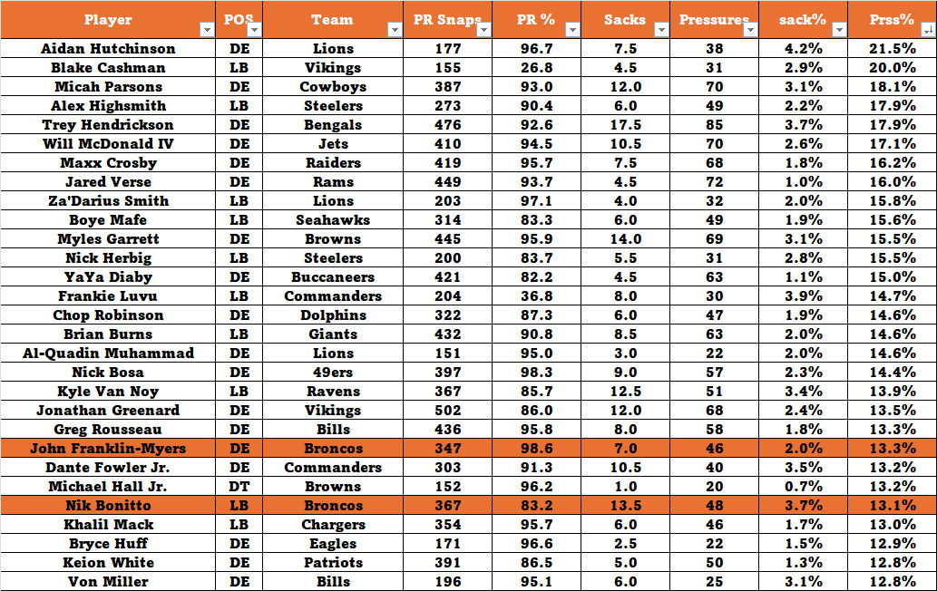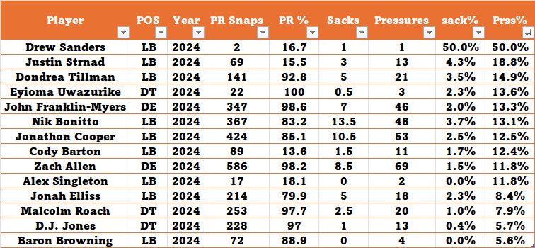 Using SISdatahub.com I pulled the data for every defender with 150 or more pass rushes in 2024. There were 208 total and seven Broncos.