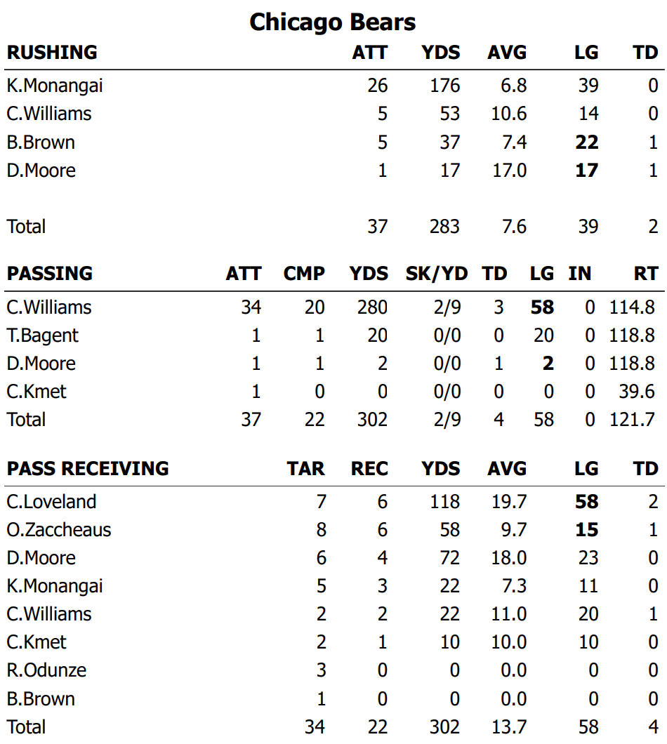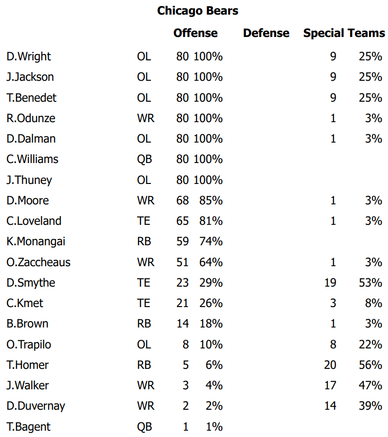 Let’s look at the Bears’ playing time breakdowns and a few individual stats from the game.