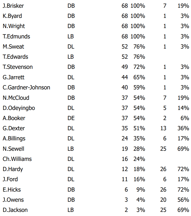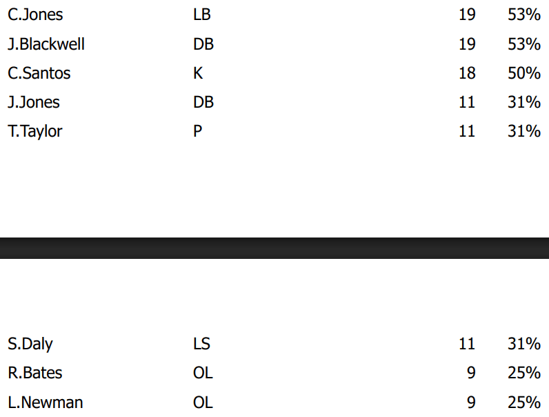 D’Marco Jackson had 3 special teams tackles, and Travis Homer and Carl Jones Jr. had 2 each.