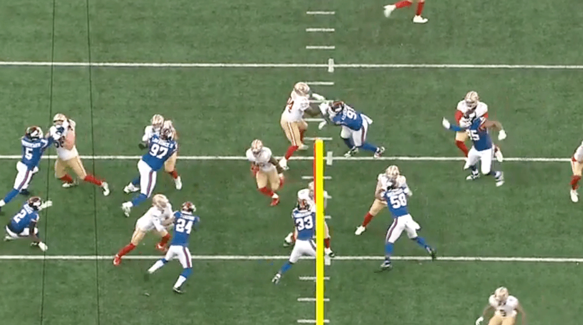 Where’s the desire, the pride? No one is getting off blocks; the Giants look absolutely deflated. Again, it’s the backside of an overloaded line of scrimmage where the Giants used an OVER front (three-teqhcunique to the strength) where Kittle and Juszczyk were located. Juszczyk inserts from the backside to pick up Okereke; Fowles is late to fit the backside B-Gap, which has been abused over the last two weeks against formations similar to this one, which allows the 49ers’ guard to quickly climb off the double-team against Dexter Lawrence (97).