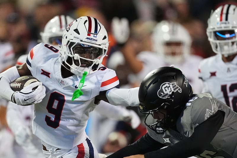 Colorado quarterback Ryan Staub (16) tackles Arizona defensive back Ayden Garnes (9) after his pass interception during game Saturday, Nov. 1, 2025, in Boulder, Colo. | David Zalubowski, Associated Press 9. Arizona Wildcats (5-3, 2-3 Big 12)Previous ranking: No. 11 (⬆️ 2)Last week: Beat Colorado, 52-17Next game: Saturday vs. Kansas, 1:30 p.m. MST (ESPN2)