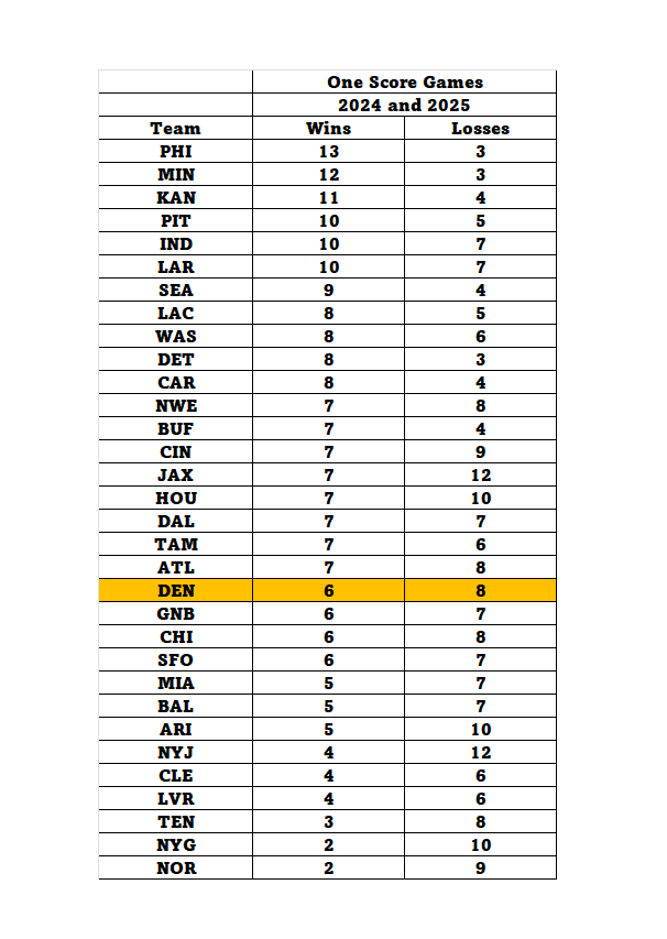 The Broncos were 1-6 in one score games last season and are 5-2 so far this season. Over the last two seasons they are still 6-8, but at least they are not the Giants who are now 2-10 in one score games over the last two seasons.