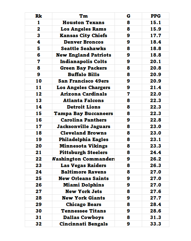 The Bronco offense has now beaten the best scoring defense in the league after having played five of the six worst scoring defenses in the league. The only one of those that the Broncos have yet to face is the Bears – Denver does not play Chicago this year. The Broncos have two games remaining with the Chiefs (3rd), Raiders (23rd) and get to face the Commanders (22nd), and the Jaguars (17th). The also have to play the Chargers (11th) and the Packers (8th).