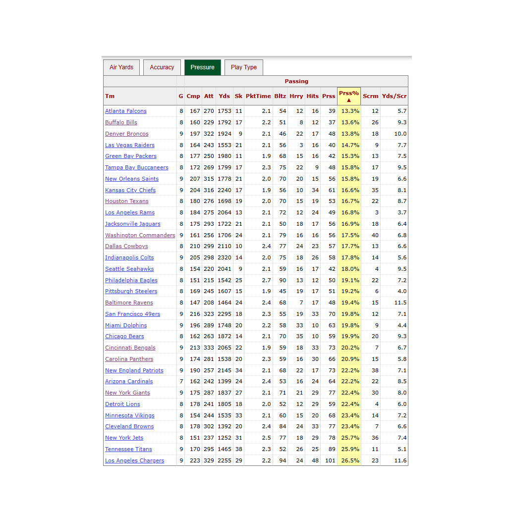 On defense the Broncos are still in second place getting pressure on the opposing QB on 27.7% of dropbacks. The D will face some of the better OLs in the NFL in the remaining eight games. The Broncos face the Raiders and Chiefs twice along with the Packers. All are in the top 8 in pass blocking. The only remaining game against a poor pass blocking team is against the Chargers.