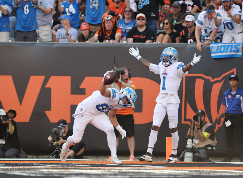 Oct 5, 2025; Cincinnati, Ohio, USA; Detroit Lions tight end Sam Laporta (87) and wide receiver Jameson Williams (1) react after a touchdown during the first quarter against the Cincinnati Bengals at Paycor Stadium. Mandatory Credit: Joseph Maiorana-Imagn Images