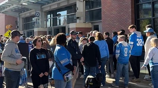 Detroit Lions fans are lined up outside Ford Field on Sunday, Nov. 2, 2025 eager to get inside for the game against the Minnesota Vikings.