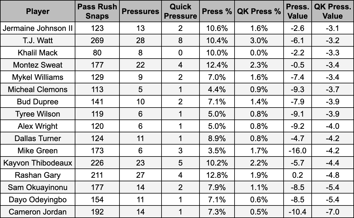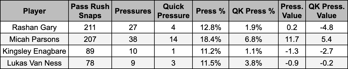 Thankfully, NFL Pro actually makes a distinction between their pressures, giving us overall “pressures” and what they call “quick pressures,” which they define as pressures under three seconds. For our purposes, I wanted to look up the group of pass rushers who had at least as many edge rushing snaps as the Packers’ group of four pass rushers in Parsons, Gary, Kingsley Enagbare and Lukas Van Ness.