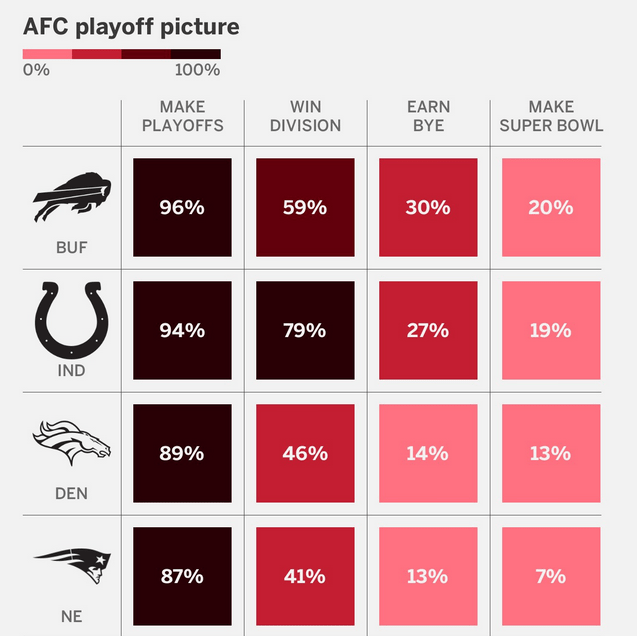 First here, as always this season, let’s check in with the latest ESPN playoff odds for the Bills in four key metrics. Buffalo continues it climb back up the chart, and now they’re all the way back in first place — ahead of every other team in the AFC. The Chiefs dropped all the way down to six and off our screen grab, which means I had to outsmart the “scrollbots” to share it here, below.