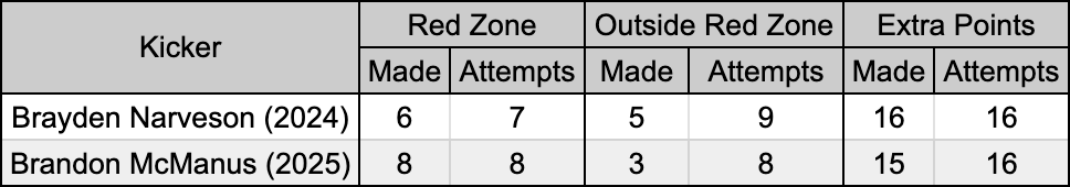 So how bad has McManus been this year, and how long is his leash? To answer this question, let’s compare him to the kicker he replaced: Brayden Narveson.
