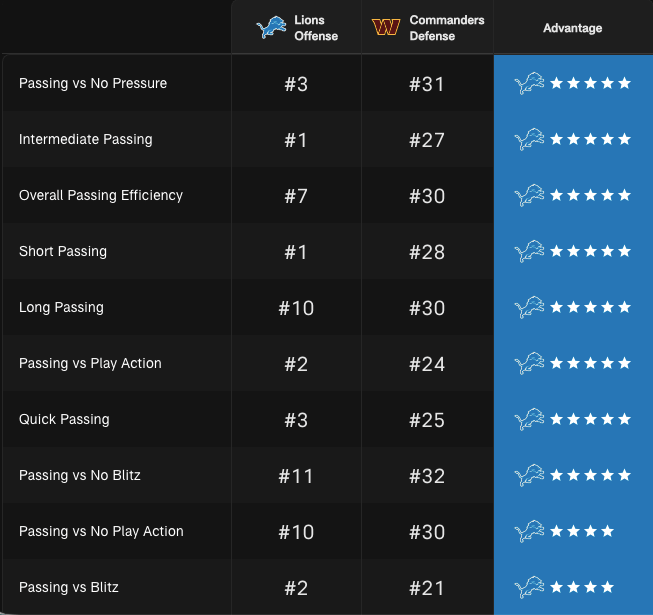 No matter what statistical measure you source—whether it be Jeremy Reisman’s On Paper, PFF, Next Gen Stats, SumerSports, etc.—the Lions’ biggest advantage in this game comes with their passing attack.