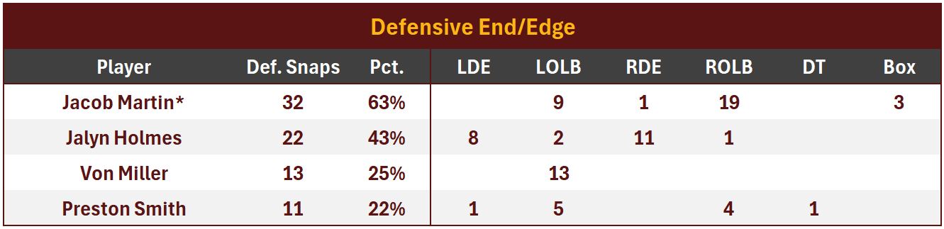 Jacob Martin got the most playing time, but did not register a pressure in 22 pass rush attempts. He registered just 2 tackle assists, one of which contributed to a defensive stop.