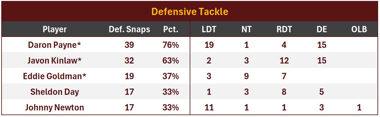 Daron Payne spent 38.5% of his defensive snaps at DE and the rest at DT, mostly on the left side of the line. He recorded 3 tackle assists and contributed to 1 defensive stop. According to PFR, he also missed 2 tackles.