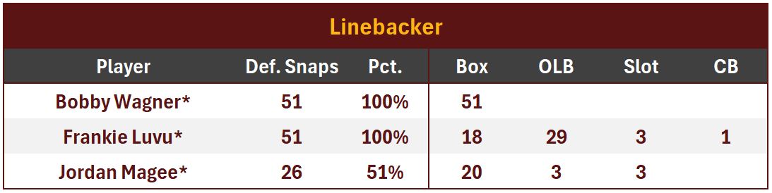 For those hearty souls with an appetite for a post mortem on the Commanders’ 14-38 loss to the Seattle Seahawks, here is my weekly summary of who got playing time, where they lined up, who stepped up (yes, a few players did), and whose play left room for improvement.
