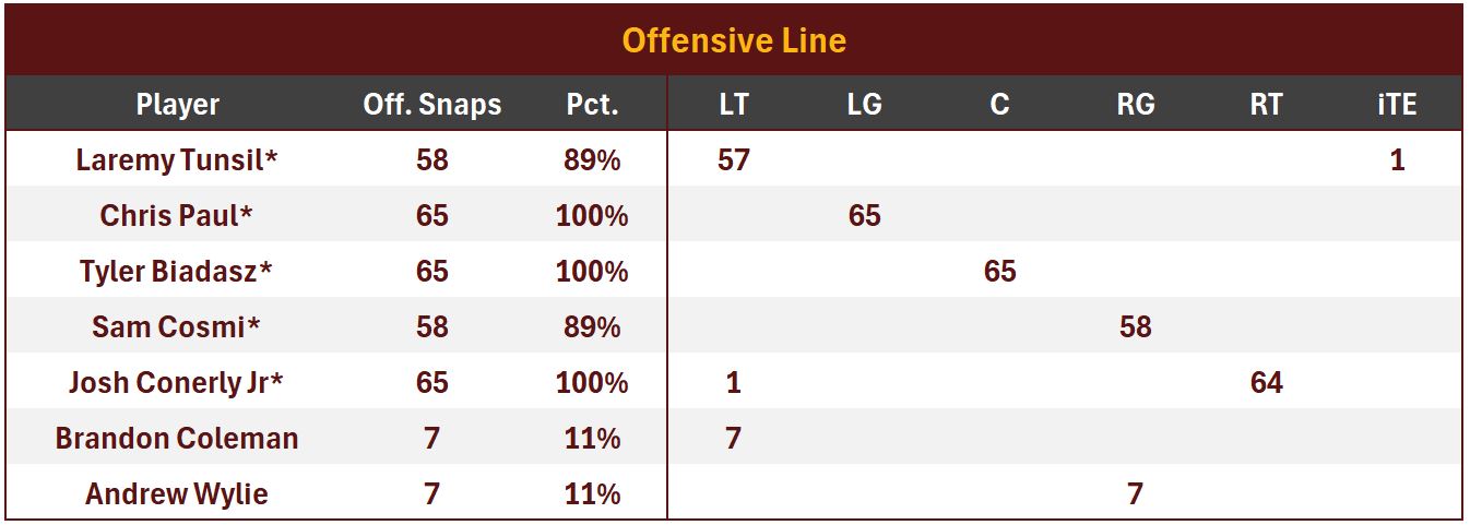 This was one of the better games this season for the rookie RT. Josh Conerly Jr allowed just 3 QB hurries in 38 pass blocking snaps. His 7.9% Pressure Rate allowed in pass protection is still a little high for a veteran starting OT, but not unusual for a rookie.