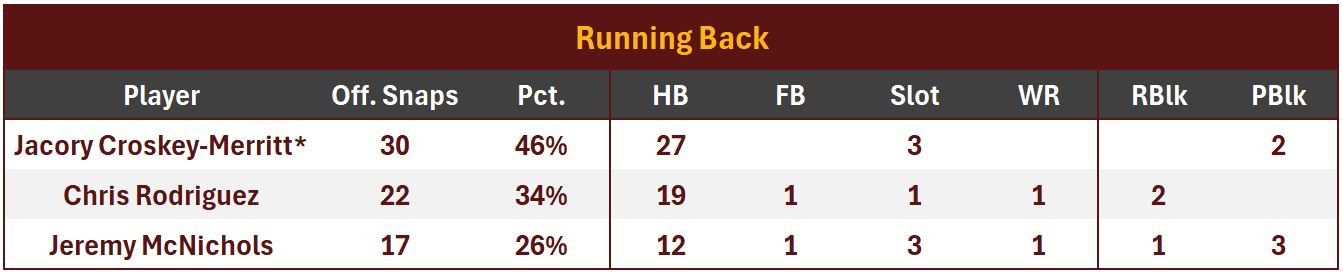 Jacory Croskey-Merritt was third on the team with 38 hard earned yards on 12 rushing attempts (3.2 Y/A). While his rushing total and rushing average were not eye-popping, he was actually effective at getting they yards the team needed, as indicated by his very respectable 58.3% rushing success rate. Bill had to work for every yard he gained, as 36 of his 38 total yards came after contact. He averaged just 0.2 YBC/att. He also caught his lone target for 3 yds.