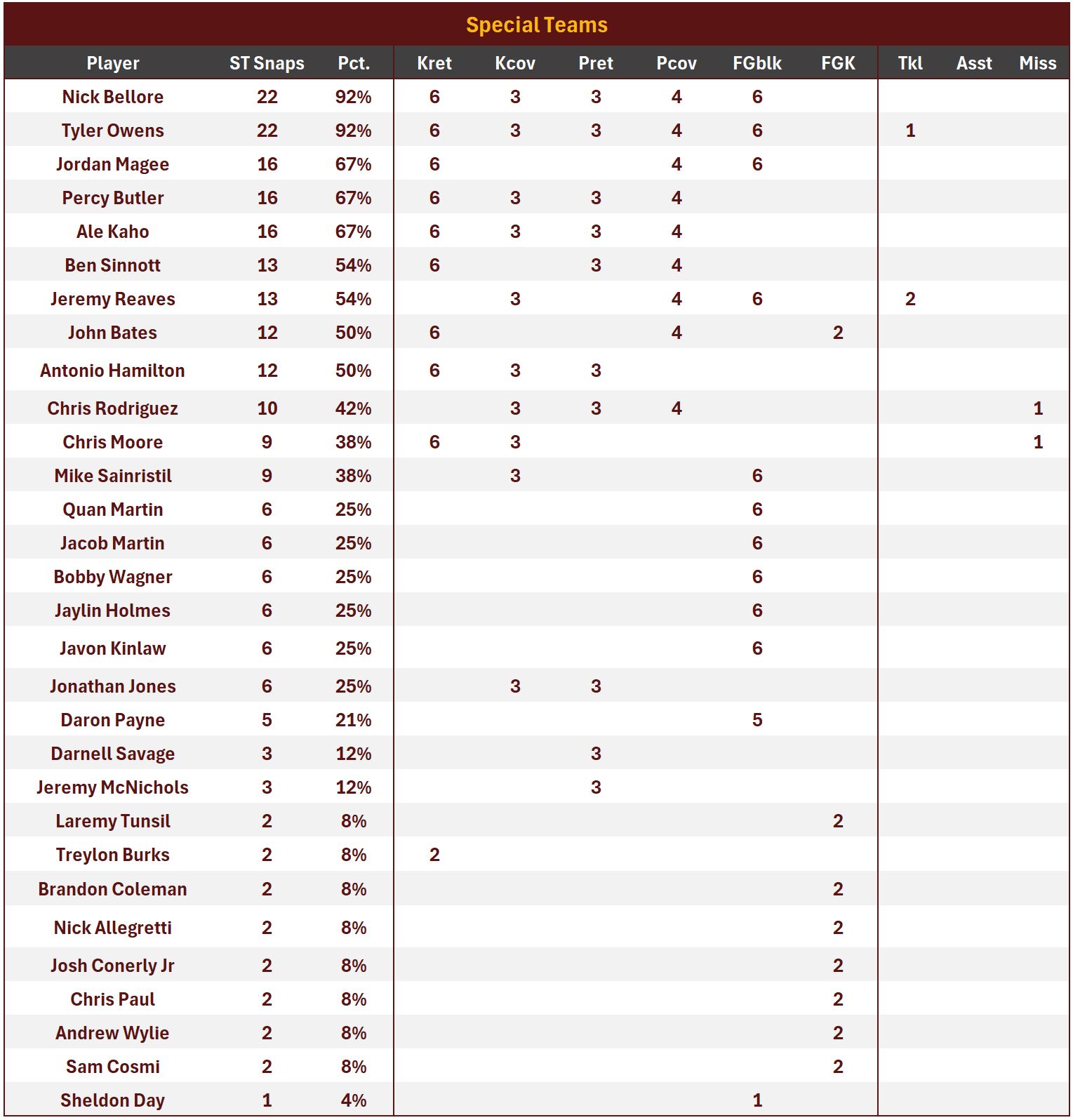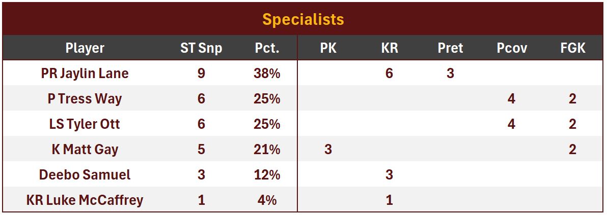 John Bates was the Commanders’ most productive receiver at an impressive 2.5 Y/RR. He caught 2/4 tgts for 20 yds, with 1 drop. He gained 16 yards after the catch.