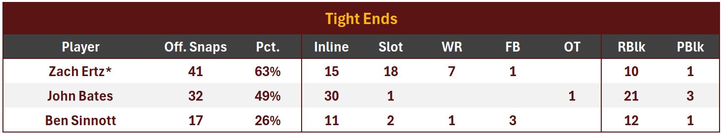 Zach Ertz led the Commanders in receiving yards with 4 rec/4 tgt for 46 yds and 2 first downs. He was the Commanders’ second most productive receiver at 1.7 Y/RR. Ertz committed two false start penalties for 5 yds a pop.