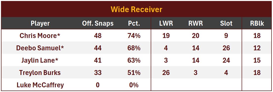 Deebo Samuel had the most targets among Washington receivers (6), led the team in receptions (5) and yards after the catch (37). He was second in receiving yards (41) and third in receiving productivity (1.52 Y/RR). His 1.0 yd Average Depth of Target was the lowest on the team.