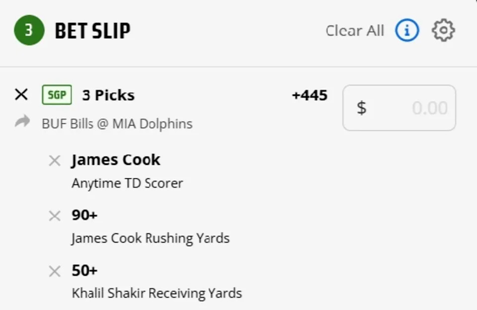 My favorite SGP for this matchup is James Cook hitting the 90-plus rushing mark with an anytime TD and Bills WR Khalil Shakir going for 50-plus receiving yards. The combination of these legs pays +445.