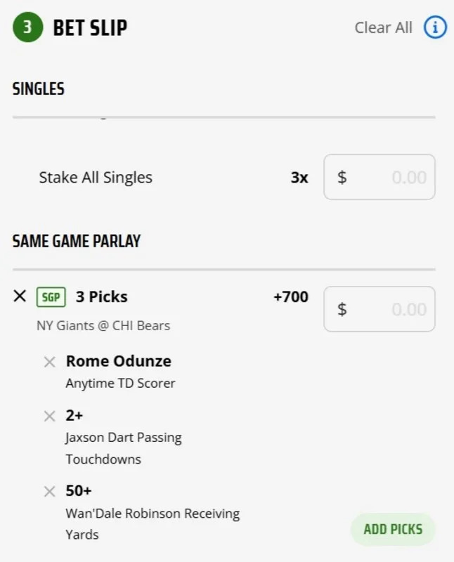 Same-Game Parlay for Giants at Bears
