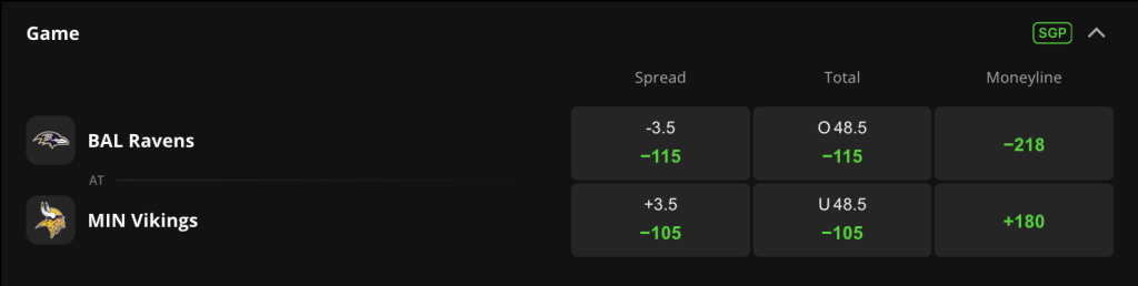 Baltimore is a 3.5-point favorite and -218 on the moneyline, while Minnesota is +180 on DraftKings Sportsbook. The game total is set at 48.5 points.