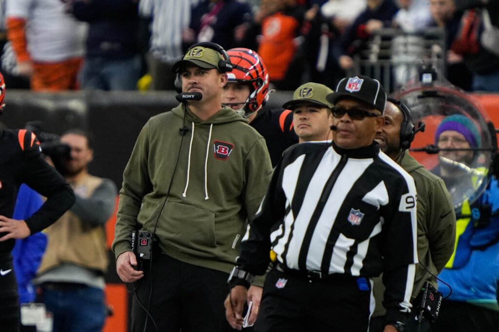 Bengals Head Coach Zac Taylor watches from the sidelines during their game against the Bears at Paycor Stadium on Sunday November 2, 2025. The Bears won the game with a final score of 47-42.