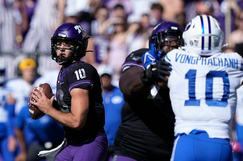 TCU quarterback Josh Hoover (10) looks to pass with blocking against BYU linebacker AJ Vongphachanh (10) during game Saturday, Oct. 14, 2023, in Fort Worth, Texas. | LM Otero, Associated Press