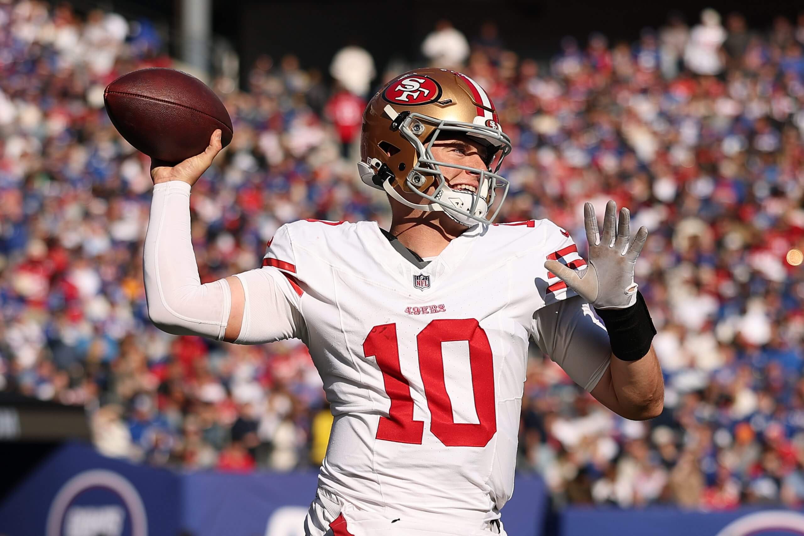 Mac Jones, who has played well for the 49ers in Brock Purdy’s absence, will be a hot commodity in the offseason. (Sarah Stier / Getty Images)