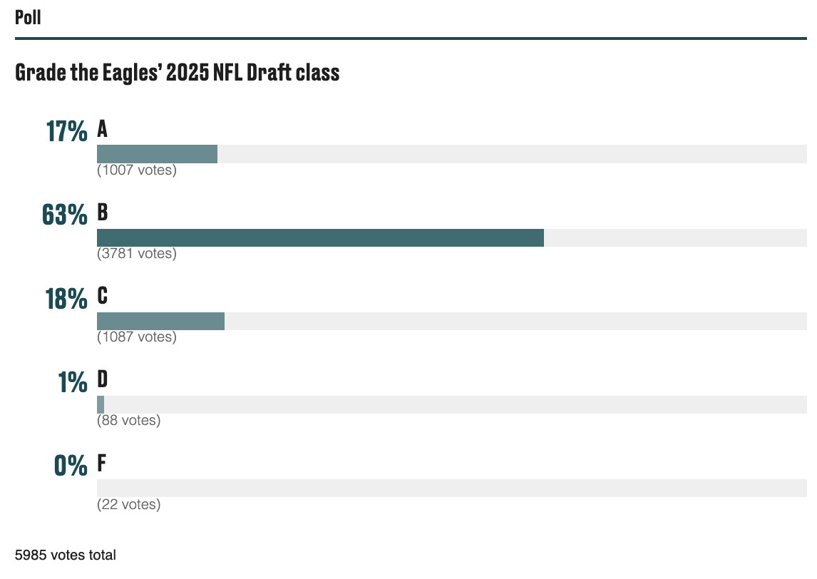 Overall: My overall grade analysis is going to be very simple. The Eagles added 10 players who all make sense from a value standpoint, most of whom also fit needs. Campbell and Mukuba both have good chances of starting as rookies, while Robinson will likely have an immediate role as a rotational defensive lineman who can play multiple spots. The rest of the Eagles’ picks all make sense from a depth and development standpoint. Is this draft likely to be as strong as last year’s when they added Quinyon Mitchell, Cooper DeJean, and Jalyx Hunt? I mean, no, but that’s a pretty high bar. But for where they were picking at 32nd overall after winning the Super Bowl, this is a strong collection of talent that makes sense in the short term (in some cases), as well as in the long term.