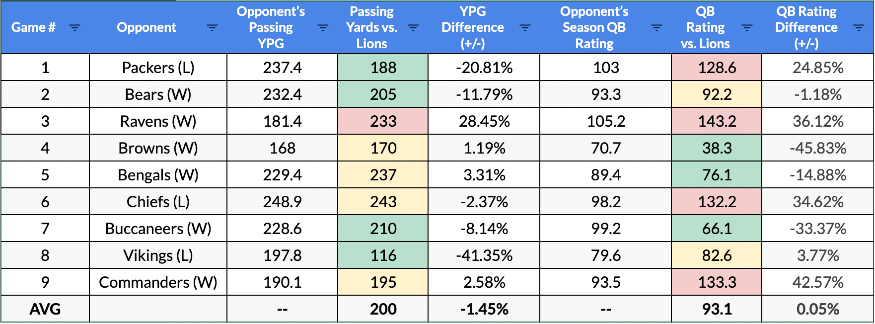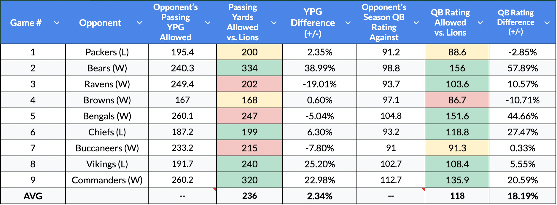 Again, the good success rate being an outlier shows that the Lions are giving up too many explosive plays. Detroit has allowed 14 passing plays of 30+ yards, which is tied for fourth-most in the NFL. If they can clean up those plays, they’ve been remarkably efficient in between them.