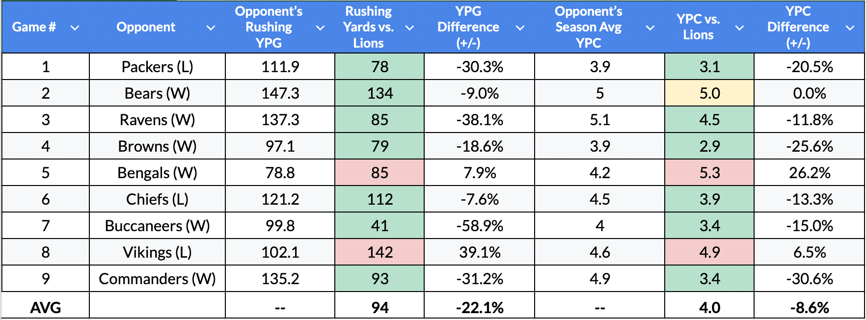 The Lions run defense hasn’t been dominant—only holding a single team under 75 rushing yards—but they’ve been pretty dang efficient, and they have yet to be truly picked apart on the ground. No team has hit the 150 yard mark, either.