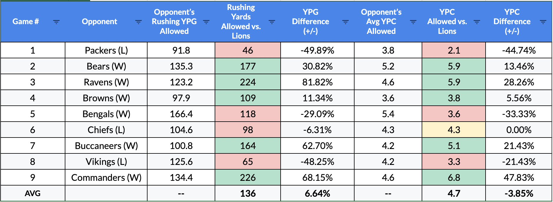 I’ve been pretty skeptical of the Lions rushing attack for much of the season, but if they can start playing like last week, any doubts will evaporate. Detroit not only found some explosive plays in the running game again, but their 48.5% success rate on the ground showed a level of down-to-down consistency that had been missing between explosives.