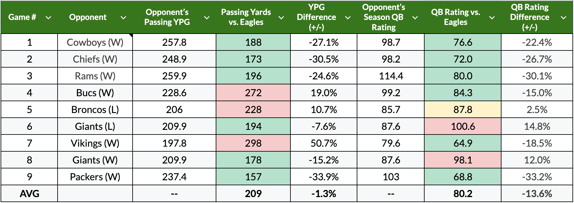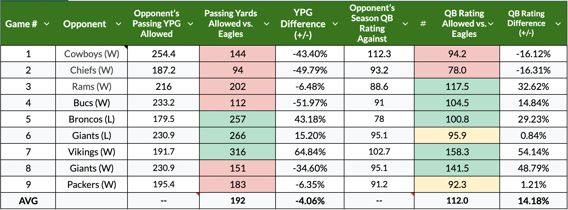 This is a stunningly good chart for the Eagles’ pass defense. And when you look closer, you see how Philly has shut down the likes of Dak Prescott, Patrick Mahomes, Matthew Stafford, and Baker Mayfield—just in the first four weeks of the season. They’ve only allowed over 250 passing yards twice, and only allowed a passer rating above 90 twice all year.
