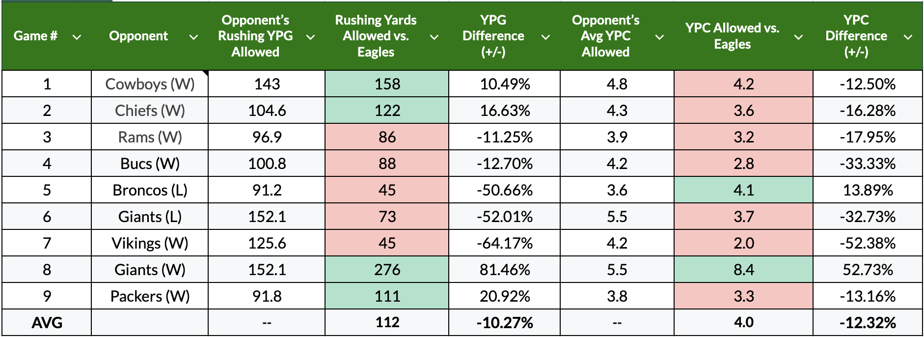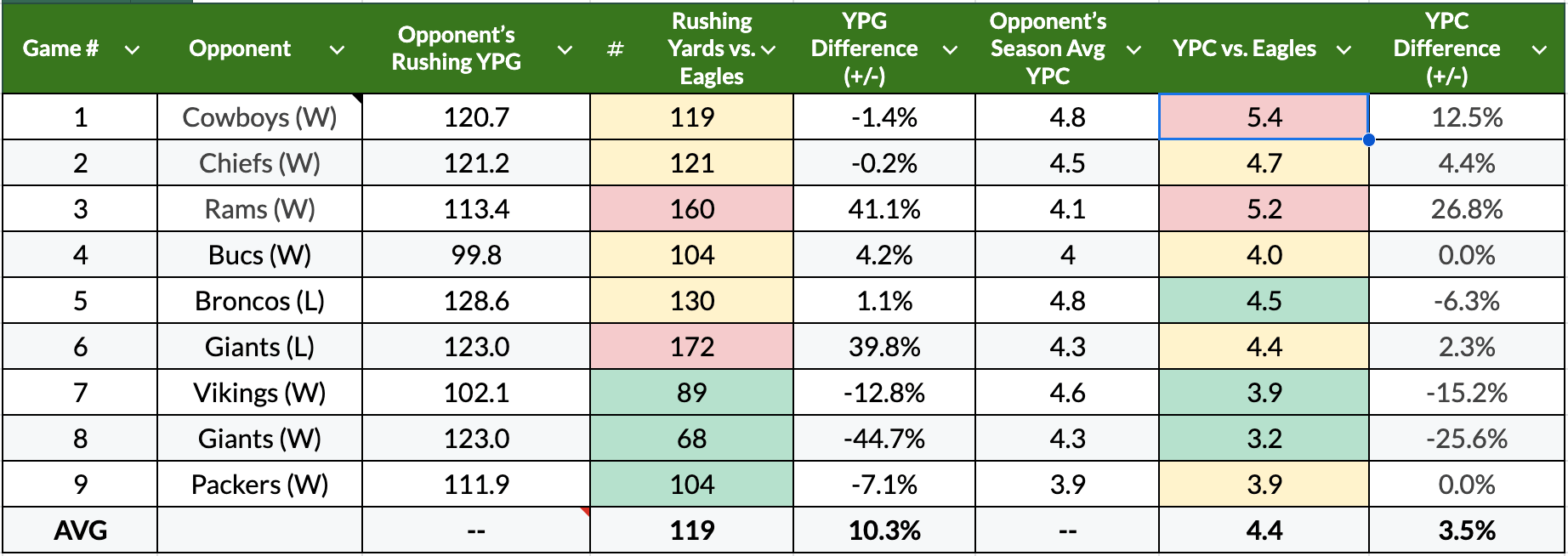 The Eagles’ run defense was a disaster to start the season, but they’ve admittedly settled down a bit as of late. Through six games, the Eagles ranked: