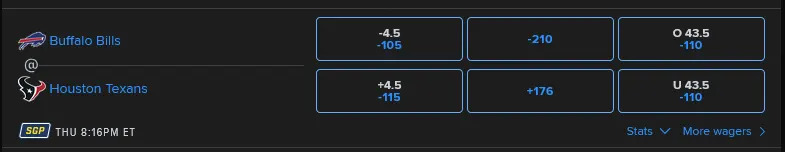 Entering the matchup for Week 12 of Thursday Night Football, FanDuel Sportsbook had the 7-3 Bills as 4.5-point (-4.5) road favorites over the 5-5 Texans. The over/under was set at O/U 43.5.