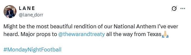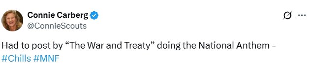 ‘Had to post by “The War and Treaty” doing the National Anthem – #Chills #MNF,’ one fan wrote, reposting a clip of the group’s performance.