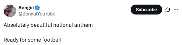 ‘One of the best National Anthem’s ever?’ one account questioned, as one stated: ‘War and Treaty just delivered the best National Anthem I’ve heard in a long time #MNF.’