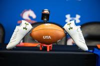 A football and pair of cleats sit before a press conference May 15 at College Park Center. UTA will be the fifth NCAA Division I university nationwide to add women’s flag football.